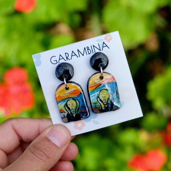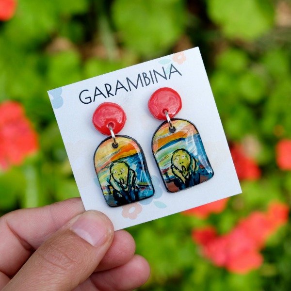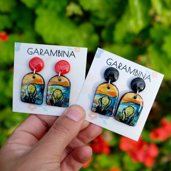 Aros realizados a mano en porcelana fría, pintados, con terminación en resina y pasante de acero quirúrgico. Son súper livianos.